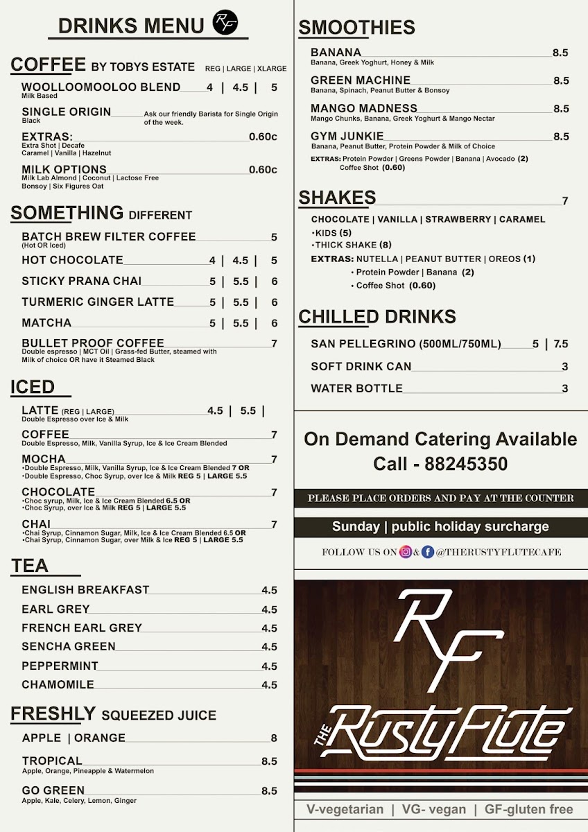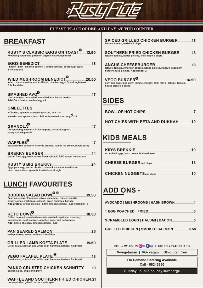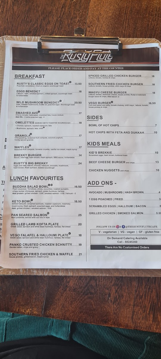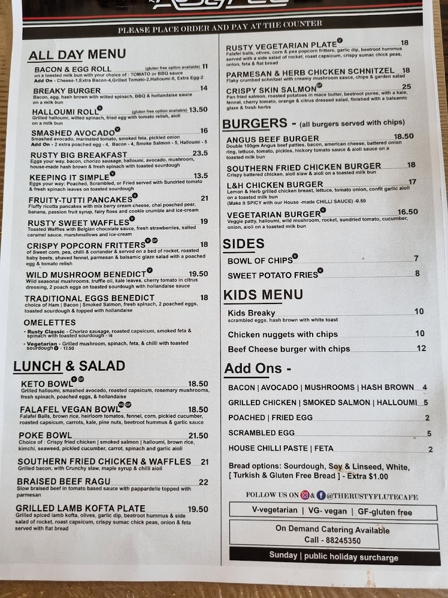 The menu at The Rusty Flute offers a delightful variety of dishes, catering to a wide range of tastes. For breakfast, options like Rusty’s Classic Eggs on Toast (V) and Eggs Benedict stand out, alongside the vegetarian-friendly Wild Mushroom Benedict (V) and Smashed Avo (V). Their omelettes are also a popular choice. For lunch, there’s a selection of hearty meals, including the Vego Burger (V), Angus Cheeseburger, and the wholesome Buddha Salad Bowl (V)(VG), with choices like the Keto Bowl (V) and Pan Seared Salmon offering something for every palate. Kids are also well catered for with meals such as the Kid’s Brekkie and Chicken Nuggets and Chips. For sides, the Hot Chips with Feta and Dukkah and a classic Bowl of Hot Chips are available. Add-ons include options like Grilled Chicken, Smoked Salmon, and Scrambled Eggs, making it easy to customize your meal. The drink menu is just as varied, with a selection of Smoothies such as Banana, Green Machine, and Mango Madness, alongside specialty drinks like the Sticky Prana Chai and Matcha. There are also classic beverages like Iced Latte, Iced Coffee, and Freshly Squeezed Juices in flavors such as Apple and Orange. The tea selection offers favorites like English Breakfast and Peppermint. With a wide range of options, from breakfast to drinks, The Rusty Flute ensures a satisfying experience for all its customers.